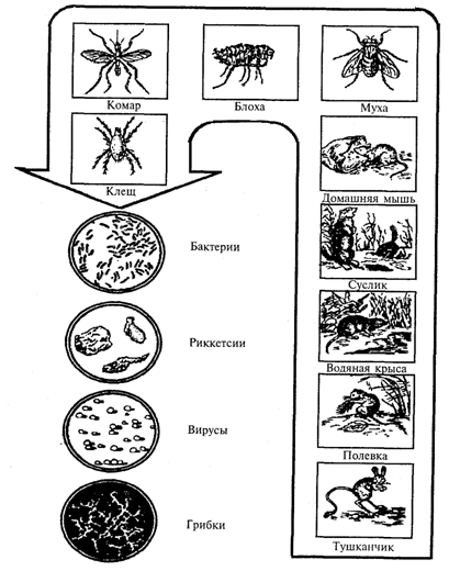 В случае появления очага заражения необходимо вводить на территории режим карантина или обсервации, выполнять профилактические и санитарно-гигиенические мероприятия. Болезнетворные микроорганизмы в зависимости от строения, биологических свойств и размеров делятся на бактерии, риккетсии, вирусы, грибки, прионы, паразитарные организмы (рис. 1.1). Прион представляет собой безвредный клеточный протеин, который в определенных условиях способен изменить свою структуру и превратиться в опасные для организма вещества. Прионы могут вызывать заболевания мозга у людей и животных ("коровье бешенство", слабоумие или смерть у людей). По размерам прионы меньше вирусов - это клетки организма, и иммунная система на них не реагирует.