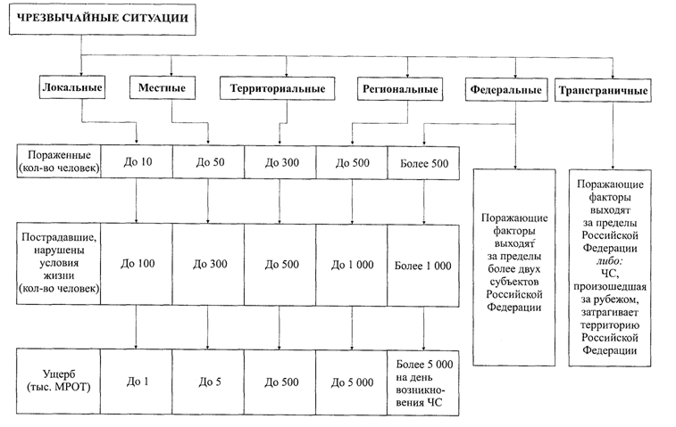 По масштабу распространения, с учетом тяжести последствий, ЧС могут быть классифицированы следующим образом: