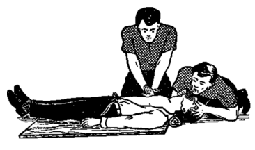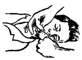 Способы проведения искусственного дыхания и наружного массажа сердца. Охрана труда Охрана труда / Оказание первой помощи пострадавшему Искусственное дыхание. Оно проводится в тех случаях, когда пострадавший не дышит или дышит очень плохо (редко, судорожно, как бы со всхлипыванием), а также если его дыхание постоянно ухудшается независимо от того, чем это вызвано: поражением электрическим током, отравлением, утоплением и т. д. Наиболее эффективным способом искусственного дыхания является способ "изо рта в рот"или "изо рта в нос", так как при этом обеспечивается поступление достаточного объема воздуха в легкие пострадавшего. Способ "изо рта в рот"или "изо рта в нос"основан на применении выдыхаемого оказывающим помощь воздуха, который насильно подается в дыхательные пути пострадавшего и физиологически пригоден для дыхания пострадавшего. Воздух можно вдувать через марлю, платок и т. п. Этот способ искусственного дыхания позволяет легко контролировать поступление воздуха в легкие пострадавшего по расширению грудной клетки после вдувания и последующему спаданию её в результате пассивного выдоха. Для проведения искусственного дыхания пострадавшего следует уложить на спину, расстегнуть стесняющую дыхание одежду и обеспечить проходимость верхних дыхательных путей, которые в положении на спине при бессознательном состоянии закрыты запавшим языком. Кроме того, в полости рта может находиться инородное содержимое (рвотные массы, соскользнувшие протезы, песок, ил, трава, если человек тонул, и т. п.), которое необходимо удалить указательным пальцем, обернутым платком (тканью) или бинтом, повернув голову пострадавшего набок (рис. 19).