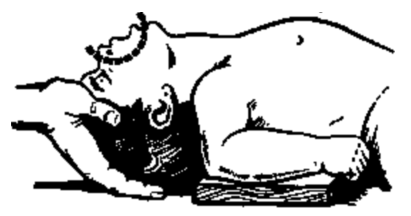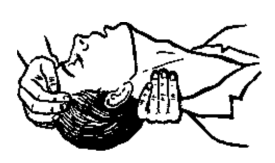После этого оказывающий помощь располагается сбоку от головы пострадавшего, одну руку подсовывает под его шею, а ладонью другой руки надавливает на лоб, максимально запрокидывая голову (рис. 20).