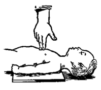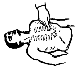 Новорожденному достаточно объема воздуха, находящегося в полости рта у взрослого. Поэтому вдувание должно быть неполным и менее резким, чтобы не повредить дыхательные пути ребенка. При появлении первых слабых вдохов у пострадавшего следует приурочить проведение искусственного вдоха к моменту начала у него самостоятельного вдоха. Прекращают искусственное дыхание после восстановления у пострадавшего достаточно глубокого и ритмичного самостоятельного дыхания. Наружный массаж сердца. Если отсутствует не только дыхание, но и пульс на сонной артерии, одного искусственного дыхания при оказании помощи недостаточно, так как кислород из легких не может переноситься кровью к другим органам и тканям. В этом случае необходимо возобновить кровообращение искусственным путем, для чего следует проводить наружный массаж сердца. Сердце у человека расположено в грудной клетке между грудиной и позвоночником. Грудина - подвижная плоская кость. В положении человека на спине (на твердой поверхности) позвоночник является жестким неподвижным основанием. Если надавливать на грудину, то сердце будет сжиматься между грудиной и позвоночником и кровь из его полостей будет выжиматься в сосуды. Если надавливать на грудину толчкообразными движениями, то кровь будет выталкиваться из полостей сердца почти так же, как это происходит при его естественном сокращении. Это называется наружным (непрямым, закрытым) массажем сердца, при котором искусственно восстанавливается кровообращение. Таким образом, при сочетании искусственного дыхания с наружным массажем сердца имитируются функции дыхания и кровообращения. Показанием к проведению реанимационных мероприятий является остановка сердечной деятельности, для которой характерно сочетание следующих признаков: бледность или синюшность кожных покровов, потеря сознания, отсутствие пульса на сонных артериях, прекращение дыхания или судорожные, неправильные вдохи. При остановке сердца, не теряя ни секунды, пострадавшего надо уложить на ровное жесткое основание: скамью, пол, в крайнем случае подложить под спину доску. Если помощь оказывает один человек, он располагается сбоку от пострадавшего и, наклонившись, делает два быстрых энергичных вдувания (по способу "изо рта в рот"или "изо рта в нос"), затем разгибается, оставаясь на этой же стороне от пострадавшего, ладонь одной руки кладет на нижнюю половину грудины, отступив на два пальца выше от ее нижнего края (рис. 26 и 27), а пальцы приподнимает (см. рис. 17). Ладонь второй руки он кладет поверх первой поперек или вдоль и надавливает, помогая наклоном своего корпуса. Руки при надавливании должны быть выпрямлены в локтевых суставах. Надавливать следует быстрыми толпами так, чтобы смещать грудину на 4-5 см, продолжительность надавливания не более 0,5 с, интервал между отдельными надавливаниями не более 0,5 с.