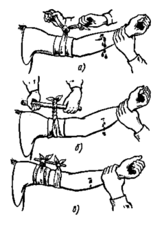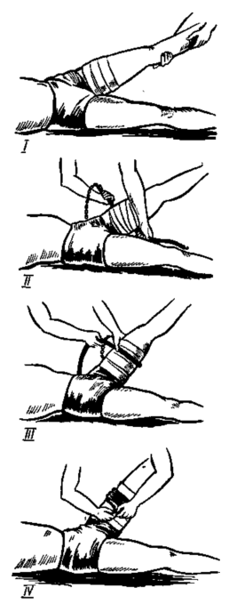 В таком положении сгиб ноги или руки надо связать или привязать к туловищу пострадавшего косынкой, шарфом или ремнем. При сильном кровотечении из раненой конечности необходимо перетянуть конечность, наложив жгут (рис. 34). В качестве жгута можно использовать какую-либо упругую растягивающуюся ткань, резиновую трубку, подтяжки и т. п. Жгут накладывают выше раны (ближе к туловищу), предварительно прижав кровоточащий сосуд пальцами к подлежащей кости, поверх одежды или какой-либо мягкой прокладки (бинт, марля или платок, сложенные в несколько слоев и обернутые вокруг конечности) для уменьшения боли и исключения возможного ущемления кожи.