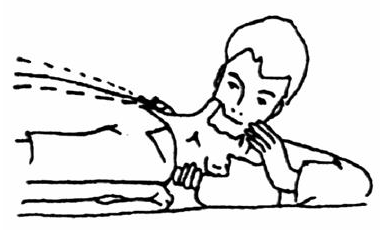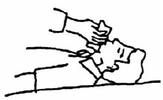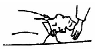 При переломе черепа пострадавшего уложить на носилки таким образом, чтобы голова была несколько приподнята, по бокам ее уложить два валика. На голову положить холод. При переломах позвоночника осторожно положить пострадавшего на носилки животом вниз и отправить в медпункт. Носилки должны быть твердыми, для чего снизу положить широкую доску. При вывихах необходимо закрепить конечность в том положении, какое она приняла. Например, при вывихе плеча под мышку положить какой-нибудь мягкий сверток, руку подвесить; при вывихе бедра подложить свернутую одежду, когда пострадавший будет положен на носилки. Вправление вывиха производится только врачом. При ушибах следует приложить к ушибленному месту холод, туго забинтовать и направить пострадавшего в медпункт. 7.9. Способы искусственного дыхания Наиболее эффективным и во многих случаях приемлемым является искусственное дыхание по методу вдувания воздуха "изо рта в рот" или "изо рта в нос". Искусственное дыхание делают, когда человек не дышит. Быстро открыть пострадавшему рот и, если там есть жидкость, слизь, удалить их носовым платком, марлей. Вынуть также съемные протезы (Рис.7). Положив человека на спину и расстегнув на нем одежду, максимально запрокинуть его голову, чтобы язык не закрыл вход в гортань (Рис.8).
