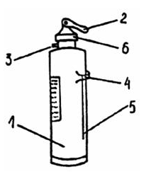 5.7. Тушение загораний необходимо производить средствами пожаротушения, имеющимися на участке. 6. Краткие правила пользования первичными средствами пожаротушения 6.1. Пенные огнетушители Предназначены для тушения различных веществ и материалов, за исключением электроустановок, находящихся под напряжением. Для приведения в действие химически-пенного огнетушителя ОХП-10 (Рис. 1), необходимо иглой (5) прочистить спрыск (3), повернуть вверх на 180° до отказа рукоятку (2), перевернуть огнетушитель крышкой (6) вниз и направить струю пены на очаг горения. Огнетушитель химически-пенный ОХП-10: