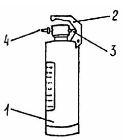 6.3. Порошковые огнетушители Предназначены для тушения нефтепродуктов, электроустановок, находящихся под напряжением до 1000 В, ценных материалов и загораний на автомобильном транспорте. Для приведения в действие порошкового огнетушителя ОП-10 (Рис. 3) необходимо нажать на пусковой рычаг (3) и направить струю порошка на очаг горения через выкидную насадку (4). Огнетушитель порошковый ОП-10: