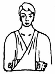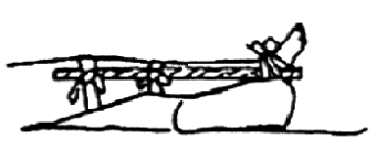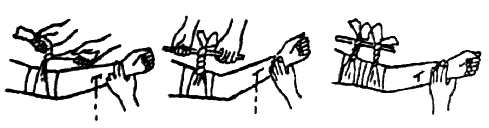 В случае кровотечения из артерии головы или когда абсолютно не из чего сделать жгут, нужно прижать артерию выше места повреждения к кости и немедленно транспортировать пострадавшего в медпункт. В тех случаях, когда нельзя наложить жгут (при кровотечении на голове, шее, грудной клетке, животе), применяют давящую повязку. При переломах нужно создать полный покой поврежденной части тела и соблюдать исключительную осторожность при переноске пострадавшего. Прежде всего следует определить место перелома. При этом не допускать движения поврежденной конечности или части тела, так как острые концы кости могут поранить окружающие ткани, мышцы, кожу, вызвать кровотечение. Необходимо наложить на поврежденную часть тела неподвижную повязку - шину. Если нет специальных шин, то можно использовать имеющийся под руками подходящий материал (доску, палки и т. п.). Шины накладывают таким образом, чтобы они захватывали не менее двух суставов, между которыми находится перелом. Под шины нужно подложить мягкий материал - вату, полотенце и пр. (Рис. 5 и 6).