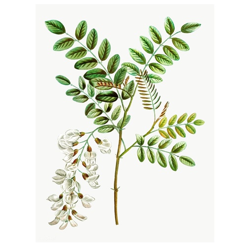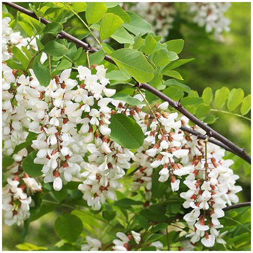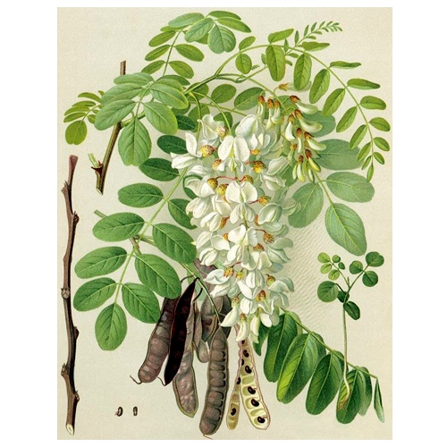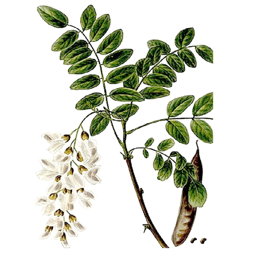 Акация белая, Robinia pseudoacacia L. Ботаническое описание, распространение, химический состав, особенности использования Семейство бобовые - Fabaceae. Дерево, достигающее на богатых почвах 30 м высоты с раскидистой ажурной кроной. Кора трещиноватая, серая или коричневая. Ветки дерева колючие. Листья непарноперистые, с 4-10 парами боковых листочков. Обладает глубокой разветвляющейся корневой системой. На корнях находятся клубеньки с бактериями, связывающими атмосферный азот и таким образом обогащающими почву. Цветки собраны в негустые пазушные кисти; венчик белый или бледно-розовый. Плод - боб. Семена узкопочковидные, коричневые, матовые, гладкие. Цветет в мае - июне. Плоды созревают в сентябре - октябре. Быстрорастущий недолговечный лесообразующий засухоустойчивый вид. Обычно произрастает на сухих богатых почвах. Встречается в культуре. Происходит из Северной Америки - ареал охватывает Аппалачские горы от Пенсильвании до Джорджии, на запад до Айовы, Миссури и Оклахомы. В цветках обнаружены гликозиды (робинии, акациин, апигенин и др.), эфирное масло; в коре и древесине - таниды (2,2-7,2 и 3,4-4 % соответственно), в коре - жирное масло, фитостерин; в коре и плодах - токсичный протеид робин. Эфирное масло содержит метиловый эфир антраниловой кислоты, индол, гелиотропин, бензилалкоголь, линалоол и альфа-терпинеол. Эфирное масло представляет собой полужидкую массу светло-желтого цвета с приятным сильным запахом цветков акации. В семенах содержание жирного масла достигает 15 %. Эфирное масло применяют в пищевой и парфюмерной промышленности. Семена акации пригодны для приготовления суррогатов кофе. Цветки белой акации издавна применяли в медицине различных стран как вяжущее и противоспазматическое средство. Кору молодых ветвей рекомендовали при повышенной кислотности желудочного сока. Цветки используют также как противовоспалительное, отхаркивающее и жаропонижающее средство, при заболеваниях почек и мочевого пузыря. Акацию белую широко используют в садово-парковом строительстве как декоративное растение. Культура пригодна для полезащитных насаждений, для закрепления оврагов, склонов, берегов. Прекрасный медонос. Авторы: Дудченко Л.Г., Козьяков А.С., Кривенко В.В.