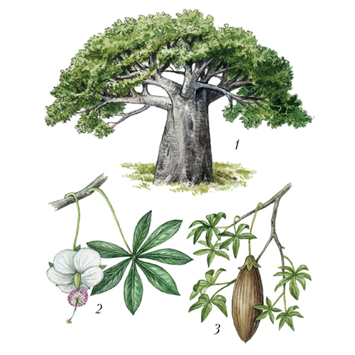 Баобаб пальчатый: 1 - общий вид; 2 - цветущий побег; 3 - ветвь с плодом