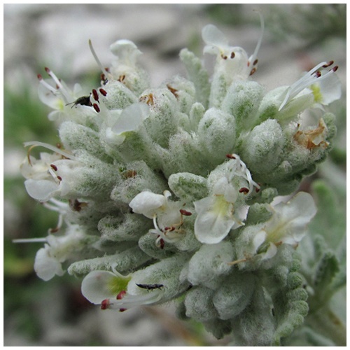 Стебель при основании древеснеющий, с многочисленными приподнимающимися извилистыми ветвями. Листья сидячие, длиной 0,5-3,5 см, ланцетные или линейные, тупые с клиновидным основанием, городчатые, густоопушенные, цветки мелкие, 5-8 см длиной, с беловатым венчиком, в сильно сближенных ложных мутовках, образующих головчатые соцветия.