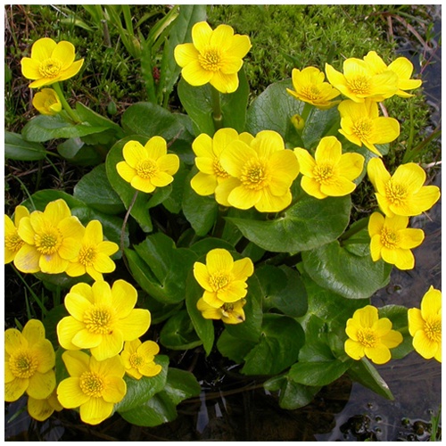 Калужница болотная - многолетнее травянистое растение с темно-зелеными блестящими крупными кожистыми листьями и многочисленными яркими золотисто-желтыми цветками.