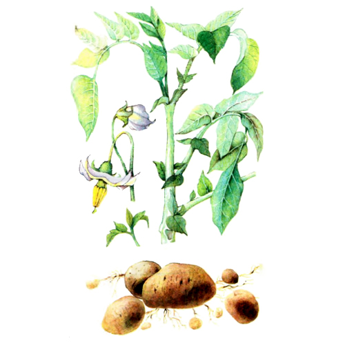 Картофель, Solanum tuberosum. Описание, иллюстрации растения Картофель, Solanum tuberosum L. Ботаническое описание, история происхождения, пищевая ценность, выращивание, использование в кулинарии, медицине, промышленности Многолетнее, культивируемое как однолетнее, травянистое самоопыляющееся клубненосное растение. Стебель прямостоячий, ветвистый, высотой до 1 м. Листья очередные, рассеченные, темно-зеленые. Цветки беловатые или розово-синеватые, собранные в раздвоенный завиток. Плод - шаровидная многосемянная ягода. Семена очень мелкие, желтые. Корневая система состоит из множества корней (столонов), на которых образуются съедобные клубни белого, красного или фиолетового цвета. Цветет в июне-июле. Родина растения - Южная Америка, где оно было введено в культуру в глубокой древности. В Европу картофель попал в XVI веке - сначала в Испанию, а затем в Италию и другие страны. Клубни картофеля трудно пробивали себе дорогу к нашему столу. Их называли чертовыми яблоками, нечистыми земляными орехами из преисподней, поскольку были известны случаи отравления плодами (семенами) растения или зелеными клубнями. В средних широтах выращивают ранне- и среднеспелые сорта. Растение прохладного влажного климата, картофель лучше всего растет при температуре 18-22 °C. Высаживают его в лунки, когда почва прогреется до 8-10 °C. Расстояние между лунками 60-70 см, глубина посадки 10-12 см. Картофель предпочитает почвы легкие и мягкие (песчаные и супесчаные, черноземы). При прорастании он требует немного влаги, но в период цветения и образования клубней потребность в ней возрастает. Чтобы поддерживать влажность почвы, необходимо кусты окучивать. Картофель хорошо отзывается на удобрения. После полива или дождя почву обязательно рыхлят, удаляют сорняки. Вегетационный период продолжается от 60 до 150 дней. Для летнего потребления убирают картофель по достижении хозяйственной спелости, иногда через 40 дней после появления всходов. При подсыхании ботвы и огрублении кожицы убирают весь картофель. Химический состав клубней богат и разнообразен. Среди питательных веществ в них больше всего крахмала, но его содержание зависит от сорта и условий выращивания. Раннеспелые сорта беднее крахмалом, в клубнях позднеспелых его значительно больше. Хотя белков в клубнях немного, они усваиваются почти полностью, что очень ценно. В клубнях содержатся витамины C, D, E, К, Н, P, B1, B2, B6, РР, U, каротин, пантотеновая кислота и др. Имеются органические кислоты, сахара, железо, фосфор и кальций. Особенно много в картофеле калия: в полтора-два раза больше, чем в большинстве овощей и фруктов, и даже в хлебе, мясе и рыбе. По содержанию наиболее ценных веществ, особенно витаминов, картофель занимает первое место среди овощей. Еще в глубокой древности люди заметили, что клубни картофеля обладают лечебными свойствами, и стали применять их при ожогах, воспалении грудной железы, кожных заболеваниях. Сырым картофелем лечили детей от рахита, золотухи. Сок сырого картофеля применяли при желудочно-кишечных заболеваниях. По сей день его используют в качестве домашнего средства при простудных заболеваниях. Клубни картофеля обладают мочегонным, спазмолитическим, противовоспалительным действием, поэтому они широко применяются при лечении ряда заболеваний. Используется картофель и в диетическом питании. Его рекомендуют л