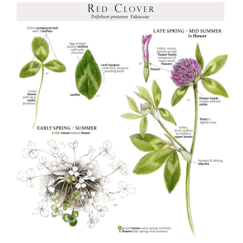 Клевер луговой, Trifolium pratense L. Описание, места произрастания, пищевая ценность, применение в кулинарии Клевер луговой - двулетнее или многолетнее травянистое растение из семейства бобовых с ветвистыми стеблями и многоцветковыми головками. Встречается по лесным опушкам и полянам, среди кустарников. Клевер является хорошим медоносом, на его розовых и белых головках с утра до вечера трудятся мохнатые шмели и трудолюбивые пчелы. С одного гектара шмели и пчелы собирают до 100 кг меда. В листьях и головках клевера содержатся витамин С, провитамин А (каротин), витамины Р и Е, гликозиды (трифолин и изотрифолин), эфирное масло и другие вещества. В пищу можно использовать головки клевера, которые заготовляют для чая во время цветения. Измельченные головки идут также для заправки супов. Из молодых листочков готовят салаты с добавлением вареных овощей (картофеля, свеклы тертой), круто сваренного яйца. Для придания острого вкуса такие салаты заправляют уксусом или соком хрена. В Кыргызстане из молодых листьев клевера готовят на бараньем сале вкусное и питательное блюдо, по утверждению местных жителей, обладающее свойствами восстанавливать силы при значительных физических нагрузках. На зиму клевер (головки и листья) заготовляют в сушеном, маринованном и квашеном виде. Автор: Кощеев А.К.