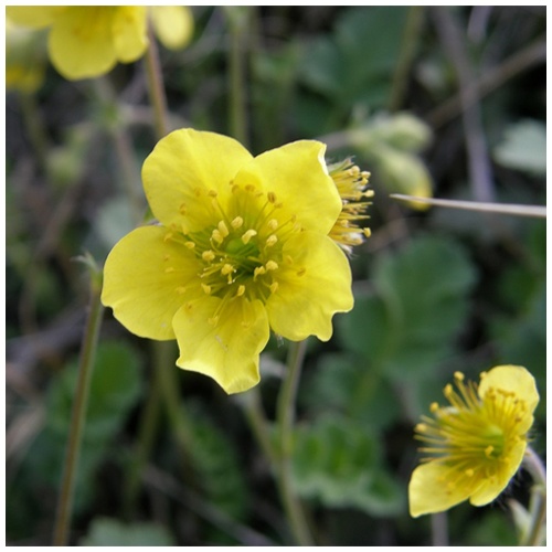 Цветки одиночные или в 2-4-цветковом соцветии; гипантий колокольчатый, с десятью выдающимися жилками, одетый желтовато-зелеными волосками; венчик ярко-желтый, лепестков 5-7, округлых, коротко-ноготковых; тычинки многочисленны. Плод - продолговато-яйцевидная, покрытая стекловидными сосочками семянка.