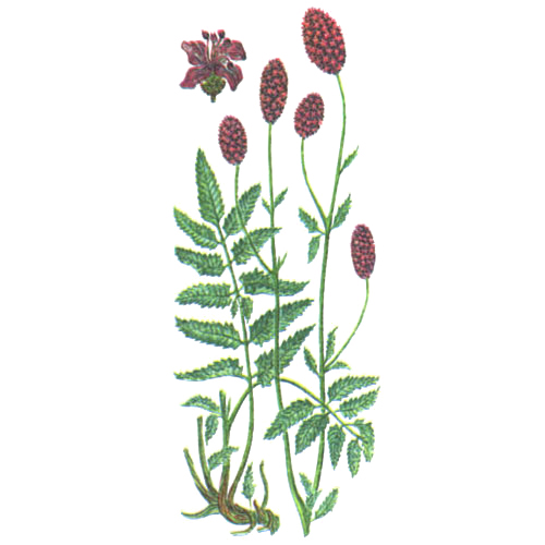 Кровохлебка лекарственная, Sanguisorba officinalis L. Ботаническое описание, ареал и места произрастания, химический состав, применение в медицине и промышленности Синонимы: красноголовник обыкновенный, красные коренья, кровососка лечебная, совья стрела, сухозолотница, чернотрав, яловый золотник и др. Многолетнее травянистое растение 20-100 см высоты, семейства розоцветных (Rosaceae). Корневище толстое, горизонтальное. Стебли прямостоячие, ребристые, внутри полые. Прикорневые листья крупные, длинночерешковые, непарноперистые, стеблевые - сидячие. Цветки мелкие, собраны в густые темно-красные, короткоцилиндрические головчатые колосья 15-30 см длины. Плодики-3-3,5 мм длины, коричневатые. Цветет в июне-августе, плоды созревают в сентябре. Ареал и места произрастания. Распространена по всей Европе, в Северной Америке и в умеренном климате Восточной Азии. Отмечена также в некоторых районах Средней Азии, в горах Тянь-Шаня. Растет по суходольным и заливным лугам, на полянах и по опушкам лесов, по обрывам, в зарослях кустарников, по берегам болот и рек. Химический состав. В корневищах содержатся дубильные вещества (до 23 %), крахмал (до 30 %), эфирное масло, сапонины, красящие вещества, галловая и эллаговая кислота. Корни содержат 16-17 %, а каллюс - до 23 % дубильных веществ пирогалловой группы; листья - аскорбиновую кислоту (до 0,92 %). Корни и корневища, кроме того, содержат макроэлементы (мг/г): калий - 5,8, кальций - 23,1, магний - 2,9, железо - 0,4; микроэлементы (мкг/г): марганец - 0,47, медь - 0,59, цинк - 1,02, кобальт - 0,04, хром - 0,03, алюминий - 0,31, барий - 5,71, ванадий - 0,12, селен - 1,39, никель - 1,15, стронций - 6,14, свинец - 0,06, йод − 0,1, бор - 2,0. Корни и корневища способны концентрировать цинк, никель, селен, а особенно барий и стронций. В стадии плодоношения листья содержат 590 мг % аскорбиновой кислоты. Применение в медицине. В качестве лекарственного сырья в научной медицине используют корневище и корень кровохлебки лекарственной (лат. Rhizoma et radix Sanguisorbae). Заготавливают осенью, очищают от остатков надземной части, отмывают от земли и высушивают. Кровохлебка оказывает вяжущее и противовоспалительное действие. Настои и отвары кровохлебки обладают бактерицидным, вяжущим и сильным кровоостанавливающим действием. Экстракты и отвары применяют при амебной дизентерии, различных желудочно-кишечных заболеваниях, при геморроидальных и маточных кровотечениях и при закупорке (тромбозе) кровеносных сосудов конечностей. Наружно ее применяют для лечения трофических язв, ожогов, в виде вяжущих полосканий при стоматитах, а также при некоторых гинекологических заболеваниях. Установлено антисептическое действие экстракта кровохлебки в отношении кишечной палочки и менее выраженное - в отношении брюшнотифозной, паратифозной и дизентерийной палочек. Кровохлебка лекарственная входит в состав противопоносного сбора. В народной медицине отвары и настои корневищ (иногда соцветий и надземной части) используют как болеутоляющее, противовоспалительное, кровоостанавливающее и вяжущее средство; при кровохарканиях у туберкулезных больных, при обильных менструациях и как наружное для заживления ран. Кровохлебку применяют как вяжущее и кровоостанавливающее средство при поносах, кровохарканье. Ее применяют также в качестве противовоспалительного средства при лечении гингивитов и стоматитов. Жидкий экстракт кровохле