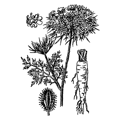 Морковь дикая, Daucus carota. Описание, иллюстрации растения Морковь дикая, Daucus carota L., морковь посевная, D. sativus (Hoffm.) Roechl. Ботаническое описание, распространение, химический состав, особенности использования Семейство сельдерейные - Apiaceae. Двулетнее, редко однолетнее растение. Корень тонкий, белый, веретеновидный, длинный. Стебель высотой 25-100 см развивается на втором году жизни, простой или в верхней части ветвистый, продольно-бороздчатый, шерстисто-волосистый, как и листья, редко почти голый. Листья треугольные, яйцевидные либо дважды или трижды продолговато-перисторассеченные. Цветки частью обоеполые, частью тычиночные; зубцы чашечки мелкие; лепестки белые или желтоватые. Соцветие - сложный зонтик. Плоды эллиптические, состоят из двух полуплодиков с четырьмя ребрышками, снабженных длинными шипами. Цветет в июне - июле. Плоды созревают в августе. В диком виде произрастает в Европе, Северной Африке, Западной и Средней Азии. Во всех частях растения содержится эфирное масло, которое придает им специфический запах. Выход эфирного масла колеблется в зависимости от местообитания. В плодах дикой моркови найдено до 7,5 % эфирного масла, в составе которого 60 геранил-ацетата, 12-14 % гераниола. В составе эфирного масла из надземной части моркови дикой, произрастающей в Молдове, найдены следующие компоненты альфа- и бета-пинен, камфен, сабинен, альфа- и бета-фелландрен, альфа- и гамма-терпинен, лимонен, n-цимол, дауцен, бета-элемен, кариофиллен, хамазулен, гамма-кадинен, бергаптен, каротол, даукол, апоренон, юниперкамфора, гераниол, геранилацетат и др. Геранилацетат и гераниол являются основными компонентами эфирного масла, их содержание 59 и 14 % соответственно. Наиболее ценным компонентом является гераниол, который используется в парфюмерии. Гераниол обладает антибактериальной активностью по отношению к дифтерийной палочке и гемолитическому стрептококку. Эфирное масло из корней дикой моркови (выход 0,01 %) содержит альфа- и бета-пинен, каротол, алифатические альдегиды, муравьиную и уксусную кислоты. В плодах до 20 % жирного масла, а также флавоновые производные. В корнях культурных красно- и желтомясных сортов содержится 0,0046-0,0090 % каротина, тиамин, рибофлавин, пантотеновая и аскорбиновая кислоты, сахара (4,5-15 %), флавоноиды, жирные и эфирные масла, умбеллиферон, соли кальция, фосфора, железа, микроэлементы кобальт, медь, бор, йод и др. Семена моркови посевной содержат до 1,6 % эфирного масла, составными частями которого являются альфа- и бета-пинен, лимонен, гераниол, цитраль, каротол, азарон и др., жирное масло, включающее глицериды петрозелиновой, пальмитиновой, олеиновой и линолевой кислот. В цветках содержатся флавоноиды кверцетин и кемпферол, а также антоциановые соединения. Морковь использовалась человеком на протяжении уже около 4 тыс. лет. Упоминается у древних греков и римлян. Сначала возделывалась как лекарственное, а затем как пищевое и кормовое растение. Корни и плоды дикой и культурной моркови могут быть использованы как пряность. Плоды, обладающие жгучим пряным вкусом, употребляют как приправу к кушаньям, используют в маринадах, ликеро-наливочном производстве. Испытаны и одобрены в качестве пряности при обработке рыбы. Плоды могут найти применение в консервной промышленности. Корнеплоды культурной моркови используют в пищу в сыром и вареном вид