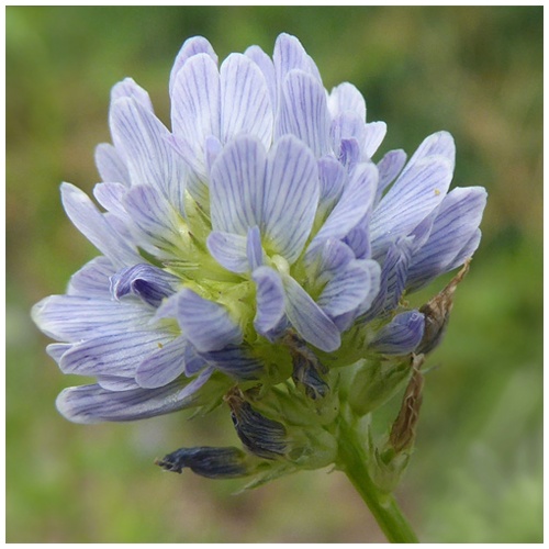 Соцветие густое, головчатое, шаровидное, после цветения не вытягивается и не становится рыхлым. Чашечка вдвое короче венчика, зубцы ее ланцетные, равные трубочке, венчик 5-6 мм длиной, голубой, выемчатый. Плод - боб, обратнояйцевидно-ромбический, в 3 раза длиннее чашечки, резко сужен в почти прямой носик, 2 мм длиной, со слабозаметными жилками.