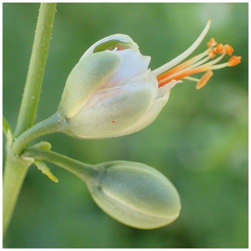 Цветки на цветоножках. Чашелистики яйцевидные или эллиптические, тупые, по краю беловато-пленчатые. Лепестки почти равны чашелистикам, обратнояйцевидные, беловатые, в нижней части оранжевые. Тычинки превышают лепестки. Коробочки направлены вниз.