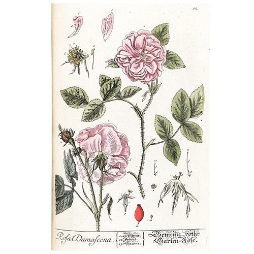 Роза дамасская, Rosa damascena Mill. Ботаническое описание, распространение, химический состав, особенности использования Семейство розовые - Rosaceae Кустарник высотой до 150-200 см. Стебли покрыты крепкими крючковидными красноватыми шипами. Листья очередные, непарноперистые, состоящие из трех-семи листочков. Листочки яйцевидно-ланцетовидные, городчато-пильчатые, снизу опушенные, сверху блестящие; прилистники железисто-реснитчатые, сросшиеся с черешками. Соцветие щитковидное или щитковидно-метельчатое, с семью - тринадцатью крупными махровыми сильно душистыми цветками. Чашелистики прикреплены по краю яйцевидного гипантия, после цветения отогнуты книзу. Лепестки широкообратнояйцевидные, на верхушке с неглубокой выемкой, к основанию сужены в короткий ноготок, розовые или бледно-красные, многочисленные. Тычинки многочисленные, свободные, с тонкими нитями. Пестики многочисленные, расположены свободно на дне гипантия. Плодики орешковидные, односемянные; образуют вместе с мясистым разросшимся цветоложем продолговатый ложный красный плод. Цветет в июне - июле. Плоды образуются крайне редко. В диком виде не встречается. Считается гибридным видом, возникшим, по-видимому, в Передней Азии. Эфирное масло содержится главным образом в лепестках. В чашечках цветков красной розы содержание розового масла достигает 8-10 %, в розовой и новых сортов роз - 5-6 % общего содержания его в цветках. Эфирное масло представляет собой сложную смесь, состоящую из твердой части - стеароптенов (соединений парафинового ряда) и жирной части. При 21-25 °С эфирное масло имеет консистенцию жирного миндального масла с сильным запахом и резким вкусом. Содержание стеароптенов в некоторых случаях достигает 50 %. Жидкая часть эфирного масла имеет светло- или зеленовато-желтый цвет. Состав эфирного масла зависит в значительной степени от места произрастания видов и способа его выделения. Масло, полученное перегонкой с водяным паром из лепестков крымской розы, содержит стеароптены - 50 %, гераниол - 20, цитронеллол - 14,3 %, а также цитраль и альдегид жирного ряда, нерол, эвгенол, фенилэтиловый алкоголь и др. Кроме того, в лепестках роз находятся антоцианы, дубильные вещества, углеводы, белки и жирное масло. В состав жирного масла входят сложные эфиры лауриновой, миристиновой, пальмитиновой, стеариновой и арахисовой кислот. Розовое масло широко используется в парфюмерной промышленности, а также при изготовлении кондитерских изделий, ликеров, вин, безалкогольных напитков. С лекарственной целью применяют лепестки розы и розовое эфирное масло. Лепестки розы применяли в народной медицине как слабовяжущее, обволакивающее, противопоносное и противо- кашлевое средство. Розовое масло используют наружно при аллергии, а также для приготовления розовой воды, изредка употребляемой как примочки для глаз при воспалении век, для аппликаций и протираний в косметике. Авторы: Дудченко Л.Г., Козьяков А.С., Кривенко В.В.