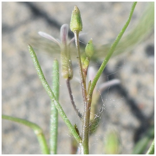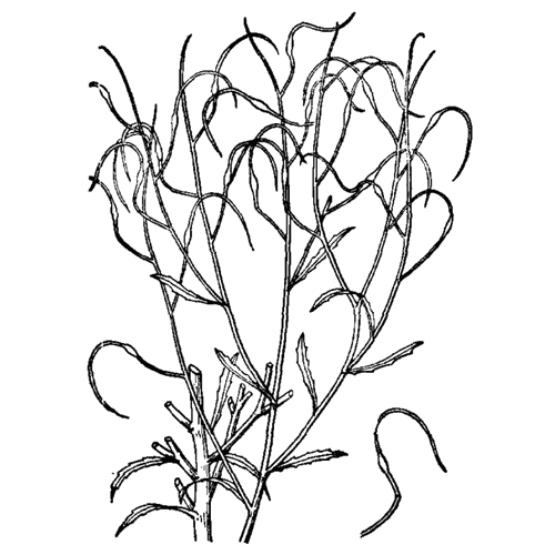 Цветки в удлиненных кистях, на тонких и длинных цветоножках. Лепестки линейные, вдвое длиннее чашелистиков, грязновато-белые. Плод - стручочек, на верхушке с длинным плоским, серповидно и спирально изогнутым носиком, сетчато-морщинистым, ячеистый.