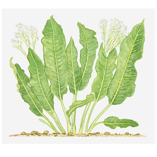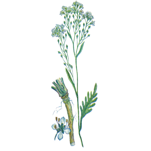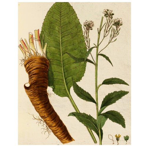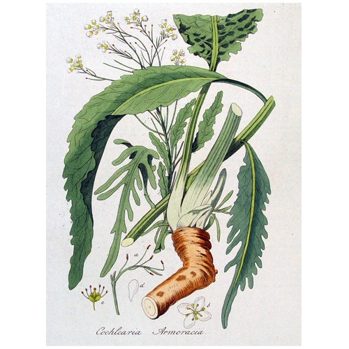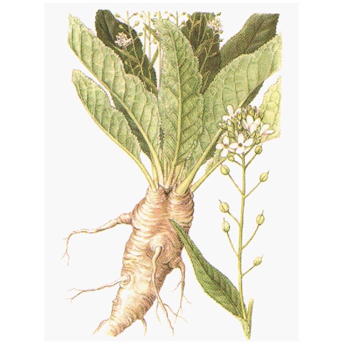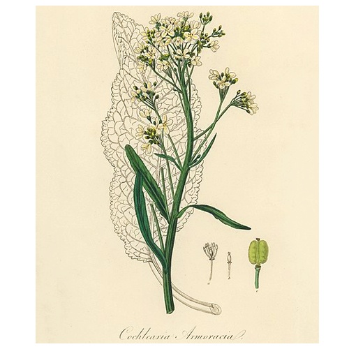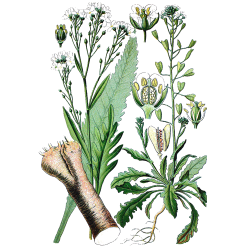Синонимы: варуха, ложечная трава, ложечный хрен, морской салат. Многолетнее травянистое растение с крупной прикорневой розеткой листьев и мясистыми корнями, семейства крестоцветных (Cruciferae). От корня отходит один или несколько прямостоячих стеблей высотой 1,5 м с очередными стеблевыми листьями. Прикорневые листья длинночерешковые, крупные, продолговатоовальные, длиной 30-60 см, шириной 10-15 см. Цветки белые, собраны в многоцветковые кисти. Плод - двухгнездный стручок почти шаровидной формы, 5-6 мм длины. Цветет с мая до июня. Ареал и места произрастания. Природный ареал - Европа (за исключением арктических районов), Кавказ и Сибирь. Произрастает по берегам рек, на сырых местах. Химический состав. Все части растения содержат эфирное масло, имеющее резкий специфический запах и вкус. Жгучий запах и вкус корней обусловлены наличием горчичного масла и синигрина. Свежий сок корня содержит фермент лизоцим, обладающее антимикробной активностью, тиамин, рибофлавин, каротин, жирное масло, крахмал, углеводы (74 %), смолистые вещества. Листья содержат 240-350 мг %, а корни 120-250 мг % аскорбиновой кислоты. В листьях обнаружены каротин, алкалоиды; в семенах - жирное масло и алкалоиды. В корнях хрена много минеральных солей (калия, кальция, магния, железа, меди, фосфора, серы и др.). Выход эфирного масла из корней после ферментации 0,05 %, его главной составной частью является аллилгорчичное масло. Кроме того, эфирное масло содержит фенилэтил- и фенилпропилгорчичное масла. В растении содержится также пероксидаза хрена - фермент, широко используемый в молекулярной биологии. В частности, этот фермент используется в иммуноферментном анализе для визуализации реакции, ассоциированной со взаимодействием антиген-антитело (окисление дианизидинового красителя с переводом в окрашенную форму), а также в некоторых методиках определения специфичных белков в образце с использованием люминесценции. Свежий корень имеет острый своеобразный вкус, при скоблении издает очень острый запах и вызывает слезотечение. При хранении постепенно теряет указанные свойства.