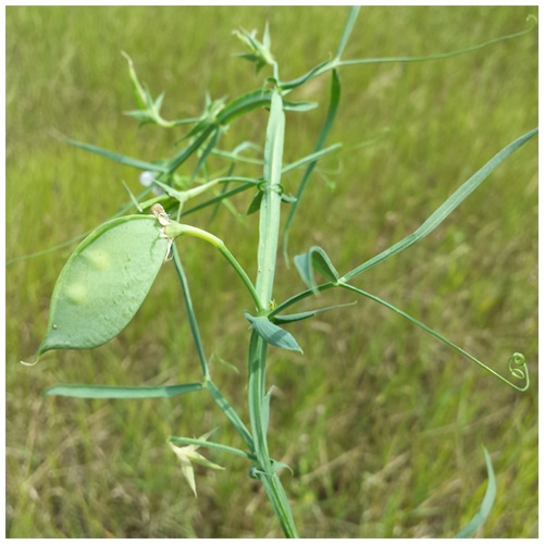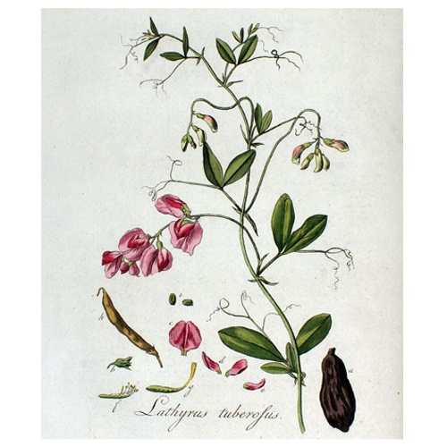 Чина клубневая, Lathyrus tuberosus L. Справочная информация Названия: фр. gesse tubereuse, anette, anotte de Bourgogne, chataigne de terre, chourless, favouette, magion, macusson, mitrouillet; англ. tuberous rooted pea; нем. Erdnuss; фл. aard noot; гол. aardakker; ит. ghianda di terra; польск. rzepnik galucha. Многолетнее растение, высотой 25-100 ом, голое; корневище разветвленное, тонкое, с клубневидно-утолщенными, веретеновидными или почти шаровидными корнями; стебли от основания ветвистые, остро-гранистые, восходящие или простертые, цепляющиеся с помощью листовых усиков; прилистники полустреловидные, 5-20 мм длины, с гранистым некрылатым черешком; черешок 8-14 мм длины. Ось листа оканчивается усиком, который у верхних листьев обычно бывает ветвистым; листочки однопарные, продолговато-овальные, туповатые, с остроконечием, 2-4,5 см длины, 0,7-1,3 мм ширины. Цветоносы длинные, иногда несколько согнутые, длиннее листа; кисти негустые с 3-7 цветками; цветоножки почти одинаковой длины с чашечкой или длиннее ее; цветки 1,5-2 см длины, пурпурово-красные, с запахом; чашечка широко-колокольчатая; флаг бледно-карминовый, на очень коротком ноготке; крылья короче флага, лодочка одинаковой длины с крыльями, на тонком ноготке; завязь сидячая. Бобы снизу отогнутые, продолговато-линейные, почти цилиндрические, голые, слегка вздутые, 2,8-4 см длины и 4-7 мм ширины, с продольносетчатым жилкованием; семян 4-6, темно-бурые, почти гладкие, мелкоточечные, рубчик линейный, на 7ю семени. Чина клубневая - хорошая кормовая трава; ее клубни охотно поедаются многими животными; используются в пищу и человеком, особенно детьми. Автор: Ипатьев А.Н.