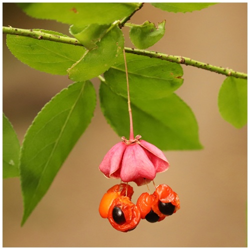 Бересклет бородавчатый, Euonymus verrucosa. Ботаническое описание растения, ареал, способы применения, культивирование Ранее слово Euonymus считалось женского рода, поэтому научное название вида записывалось как Euonymus verrucosa. Такой вариант написания встречается в русскоязычной ботанической литературе до настоящего времени. В Венском кодексе ботанической номенклатуры (2006) закреплено написание Euonymus verrucosus. Научное название рода Euonymus происходит от греческого "еu" (хорошо) и "onyma" (имя), т.е. растение с хорошим (знаменитым) именем. Название это ироническое, так как "euonymos" у греков - олеандр с ядовитыми листьями, а у римлян - бересклет, семена которого ядовиты и раньше применялись для борьбы со вшами. Видовой эпитет verrucosus ("бородавчатый") происходит от латинского слова verruca ("бородавка"). Бересклет бородавчатый имеет три характерных особенности: многочисленные чечевички (бородавочки) на побегах; "мышиный" запах цветков; похожие на головастиков черные семена с оранжевыми присемянниками, свешивающиеся из розовых плодов. Это прямостоячий листопадный кустарник; высота взрослых растений - от одного до двух метров. Бересклет бородавчатый сохраняет семядоли и зеленые листья до трех лет, а под пологом леса - до 7-8-летнего возраста, что указывает на то, что когда-то бересклеты были вечнозелеными. Время жизни растения - до пятидесяти лет. За первые пятнадцать лет куст вырастает примерно до полутора метров, после чего его рост существенно замедляется, а после тридцати лет прекращается. Корневая система поверхностная, с большим количеством мочковатых корешков. Ветви тонкие, покрыты множеством бурых или черноватых бугорков - наростов (бородавочек), из-за которых вид и получил свое название. Эти образования (так называемые "чечевички") состоят из рыхлой ткани, через которую может проходить воздух, и служат отдушинами в опробковевшем покрове ветвей - через них дышат живые ткани. Молодые ветки имеют темно-зеленую окраску; очень тонкие; имеют гребневидные выросты из опробковевшей ткани, служащие для повышения прочности. Листья простые, супротивные, гладкие, яйцевидно-продолговатые, по краю мелкопильчатые. Зеленая весенняя и летняя окраска осенью сменяется на розовую или красно-розовую. Цветки мелкие, невзрачные, относительно плоские; собраны в небольшие метельчатые соцветия (по три, пять или семь штук), расположенные в пазухах листьев на длинных цветоножках. Чашелистиков четыре, они плотно прилегают к лепесткам. Лепестков также четыре; их окраска зеленоватая, зеленовато-бурая, коричневатая; они имеют округлую форму, широко распростерты, расположены в одной плоскости. Тычинок четыре, они прикреплены к мясистому нектарному диску. Столбиков также четыре, они находятся к центре нектарного диска. Запах у цветков неприятный, "мышиный". Бересклет бородавчатый начинает цвести в мае и время начала его цветения обычно совпадает с временем начала цветения ландыша майского (Convallaria majalis). Продолжительность цветения - несколько недель. Опыление происходит с помощью насекомых - цветки бересклета бородавчатого привлекают прежде всего цветочных мух с короткими хоботками. Плод бересклета бородавчатого - кожистая сухая четырехраздельная ягодообразная коробочка, внутри которой находятся семена, покрытые сочной мясистой тканью - присемянником. С той стороны, которая выступают нар