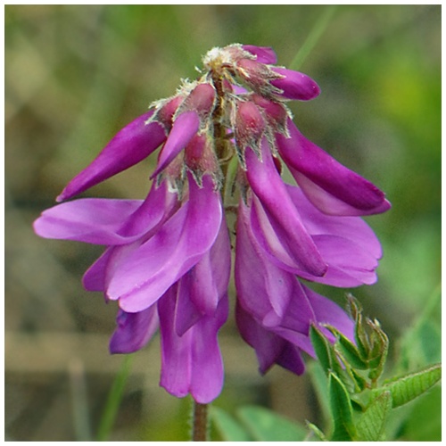 Прицветники бурые, ланцетные, достигающие длины чашечки; цветоножки сравнительно короткие, не длиннее 2 мм; чашечка коротко-колокольчатая, преимущественно по зубцам слабо опушенная, зубцы чашечки коротко-треугольные, в 3-4 раза короче трубки чашечки; венчик 13-15 мм длины, лиловый; флаг суженный и короткий; широкий ноготок, пластинка его округло-овальная, на верхушке слегка выемчатая.