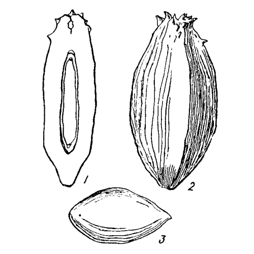 Такако: 1 - продольный разрез плода; 2 - плод; 3 - семя