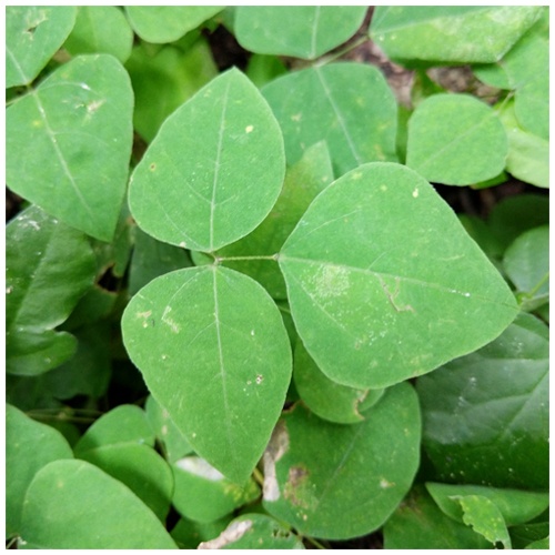 Листья тонкие на длинных волосистых черешках, тройчатые; прилистники маленькие; листочки 2-7 см длины, овальные, заостренные или почти ромбовидные, на коротких черешочках.