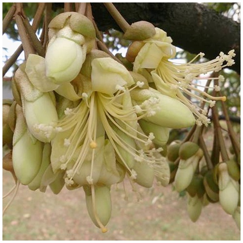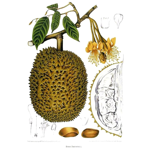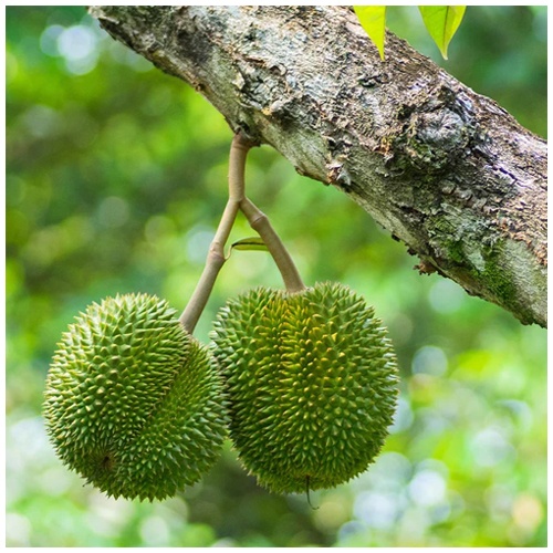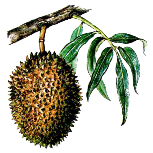 Durio zibethinus Murr. - дуриан, дерево до 45 м в высоту, соцветие сложное, цветки обоеполые, плод массой до 4 кг и длиной до 30 см, толстая кожура густо покрыта толстыми шипами в 1-1,5 см. Мякоть белая или кремовая; вкус исключительный, но запах отталкивающий. Вид в диком состоянии растет в западной части п-ова Малакка.