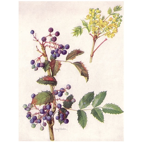 Магония падуболистная, Mahonia aquifolium. Описание, иллюстрации растения Магония падуболистная, Mahonia aquifolium. Ботаническое описание растения, ареал, способы применения, культивирование Родовое название магонии получили в честь американского садовода ирландского происхождения Бернарда МакМагона (1775-1816), успешно занимавшегося акклиматизацией на восточном побережье США растений, которые были привезены с запада страны экспедицией Льюиса и Кларка (1803-1806), а также автора американского Садового Календаря, который был опубликован в 1806 году. Падуболистной данный вид магонии назван за внешнее сходство ее листьев с падубом остролистным. Магонию также называют в народе ландышевый кустарник, падубный виноград, падуболистный барбарис - за форму и аромат ее цветков, напоминающих ландыши, за колючие листочки, подобные падубу, и за ягоды, похожие на темный виноград. Магония падуболистная - невысокий вечнозеленый кустарник с кожистыми листьями и ярко-желтыми цветами, похожими на мимозу. Данный вид кустарника небольшой - до 1 м в высоту и 1,5 м в ширину. На молодых побегах кора розовато-серого цвета, а на старых - буро-серая, с продольными полосами. В течение почти всего года листья магонии падуболистной насыщенного бронзово-зеленого цвета на красных стеблях, а зимой они окрашиваются в яркие красные и даже пурпурные оттенки. Листья непарноперистые, состоят из 5-9 листочков, длиной от 15 до 20 сантиметров. Листочки кожистые, сверху темно-зеленого цвета и глянцевые, сеть жилок вдавлена в мякоть листа; снизу листья матовые, бледно-зеленого цвета, край выемчато-острозубчатый. Листочки длиной от 3 до 9 сантиметров, шириной от 1,5 до 2,5 сантиметров. Боковые листочки неравнобокие, прикреплены на красноватых черешках длиной от 0,5 до 2 сантиметров. Цветки магонии падуболистной диаметром около 8 миллиметров, собраны в большие метелки или кисти, светло-желтого цвета с лимонным оттенком, довольно яркие, душистые. Растение является отличным медоносом. Цветение происходит в апреле-мае. Ягоды магонии по форме продолговато-эллиптические, длиной до 10 миллиметров, шириной - до 8, покрыты пушком. По цвету они сначала зеленые, а по мере созревания приобретают необычный для других растений темно-фиолетовый цвет с сизым налетом. Внутри ягод содержится 2-8 продолговатых семян, каждое длиной до 4,5 миллиметров. На вкус плоды кисло-сладкие. Созревание происходит в августе-сентябре. На кусте после созревания ягоды могут оставаться до 5 месяцев, при этом их вкусовые качества и полезные свойства не ухудшаются. Магония падуболистная - наиболее нетребовательный и холодостойкий кустарник из магоний. Ее естественным ареалом являются западные штаты США от Британской Колумбии до Калифорнии. Растение было интродуцировано в Европе в 1823 году и с тех пор распространилось фактически повсеместно. Магония падуболистная может расти практически в любых, даже самых неблагоприятных условиях. Она быстро расползается, образуя обильные заросли из-за разрастания корневой системы (корневых отпрысков). Посадки магонии падуболистной очень часто можно встретить на курортах Кавказских Минеральных Вод, хотя расти она может вплоть до широты Архангельска. Примечательно, что даже на севере магония падуболистная остается вечнозеленым растением. Плоды магонии содержат много витамина С, корни содержат берберин 