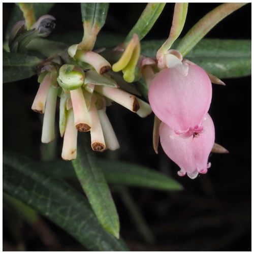 Цветки розовые (иногда другого цвета - от белого до темно-красного), поникшие. Собраны по несколько штук на длинных красноватых цветоножках, расположенных на концах прошлогодних побегов. Лепестки сросшиеся. Венчик яйцевидно- или шаровидно-кувшинчатый (бокальчатый), внутри опушенный, что мешает мелким насекомым проникать в цветок. Тычинок десять, с красными пыльниками и придатками в виде двух маленьких острых рожков, столбик один.