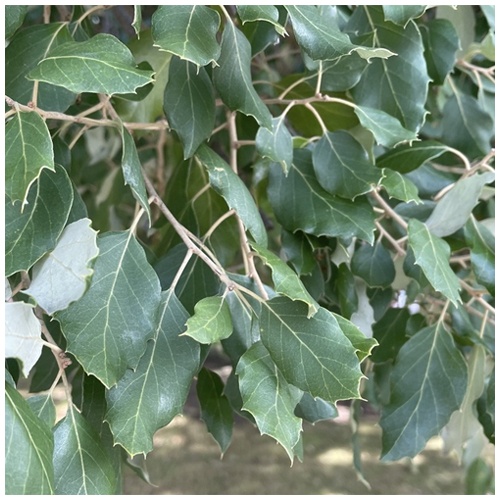 Листья на черешках 1-1,5 см длиной, овальные или удлиненно-овальные, 3-7 см длиной и 1,5-3,5 см шириной, цельнокрайние или с немногими небольшими острыми зубцами, сверху блестяще темно-зеленые, снизу густо серо-опушенные, редко почти голые, вечнозеленые, кожистые.