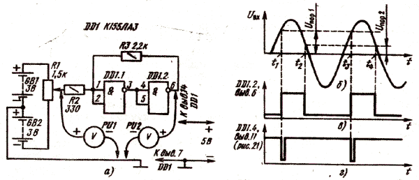 Справочник / Радио - начинающим На базе только одной микросхемы К155ЛАЗ, используя все ее логические элементы, можно построить сравнительно простой прибор, способный измерять частоту переменного напряжения примерно от 20 Гц до 20 кГц. Входным элементом такого измерительного прибора служит триггер Шмитта - устройство, преобразующее подаваемое на его вход переменное напряжение синусоидальной формы в импульсы прямоугольной формы той же частоты. То есть оно преобразует синусоидальные "импульсы"с пологими фронтом и спадом в прямоугольные, имеющие крутые фронт и спад. Триггер Шмитта "срабатывает"при определенной амплитуде входного сигнала. Если она меньше порогового значения, импульсного сигнала на выходе триггера не будет. Начнем с опыта. Пользуясь схемой триггера Шмитта, показанной на рис. 1, а, смонтируйте на макетной панели микросхему К155ЛАЗ, включив в работу только два ее логических элемента. Здесь же, на панели, разместите батареи GB1 и GB2, составленные из двух гальванических элементов 332 (или 316) каждая, и переменный резистор R1 сопротивлением 1,5 или 2,2 кОм (желательно с функциональной характеристикой А- линейной). Выводы батарей подключайте к резистору только на время опытов. Включите питание микросхемы и по вольтметру постоянного тока установите движок переменного резистора в такое положение, при котором на левом по схеме выводе резистора R2, являющемся входом триггера Шмитта, будет нулевое напряжение. При этом элемент DD1.1. окажется в единичном состоянии, на его выходе будет напряжение высокого уровня, а элемент DD1.2-в нулевом Таково исходное состояние элементов этого триггера.
