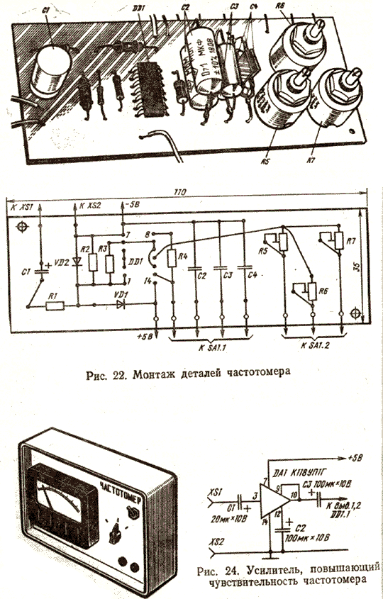 Конденсатор С1-разделительный. Пропуская широкую полосу колебаний звуковой частоты, он преграждает путь постоянной составляющей источника сигнала. Диод VD2 замыкает на общий провод отрицательные полуволны входного напряжения (он дублирует внутренние диоды на входе элемента DD1.1, поэтому этот диод можно не устанавливать). Диод VD1 ограничивает амплитуду положительных полуволн, поступивших на входы элемента DD1.1, на уровне напряжения питания. С выхода триггера Шмитта (с выхода элемента DD1.2) импульсы положительной полярности поступают на вход формирователя. Элемент DD1.3 включен инвертором, a DD1.4 используется по своему прямому назначению - как логический элемент 2И-НЕ. Как только на входе формирователя - на соединенных вместе входах элемента DD1.3- появляется напряжение низкого уровня, он переключается в единичное состояние и через него и резистор R4 заряжается один из конденсаторов С2-С4. По мере зарядки конденсатора положительное напряжение на нижнем входе элемента DD1.4 повышается до высокого уровня. Но этот элемент остается в единичном состоянии, так как на втором его входе, как и на выходе триггера Шмитта, - низкий уровень напряжения. В таком режиме через микроамперметр РА1 протекает незначительный ток. Как только на выходе триггера Шмитта появляется напряжение высокого уровня, элемент DD1.4 переключается в нулевое состояние и через микроамперметр начинает протекать значительный ток, определяемый сопротивлением одного из резисторов R5-R7. Одновременно элемент DD1.3 переключается в нулевое состояние, и заряженный конденсатор формирователя начинает разряжаться. Через некоторое время напряжение на нем снизится настолько, что элемент DD1.4 вновь переключится в единичное состояние. Таким образом, на выходе формирователя появляется короткий импульс низкого уровня (см. рис. 1, г), в течение которого через микроамперметр протекает ток, значительно больший, чем начальный. Угол отклонения стрелки микроамперметра пропорционален частоте следования импульсов: чем больше частота, тем больше угол. Длительность импульсов на выходе формирователя определяется продолжительностью разрядки включенного времязадающего конденсатора (С2, СЗ или С4) до напряжения переключения элемента DD1.4. Чем меньше емкость конденсатора, тем короче импульс, тем большую частоту входного сигнала можно измерить. Так, с времязадающим конденсатором С2 емкостью 0,2 мкФ прибор способен измерять частоту колебаний ориентировочно от 20 до 200 Гц, с конденсатором С3 емкостью 0,02 мкФ - от 200 до 2000 Гц, с конденсатором С4 емкостью 2000 пФ - от 2 до 20 кГц. При налаживании подстроечными резисторами R5-R7 стрелку микроамперметра устанавливают на конечную отметку шкалы, соответствующую наибольшей измеряемой частоте каждого из поддиапазонов. Минимальный уровень переменного напряжения, частоту которого можно измерить,-около 1,5 В, а максимальный- 8...10 В. Еще раз проанализируйте графики на рис. 1, чтобы закрепить в памяти принцип работы частотомера, а затем дополните собранный на макетной панели триггер Шмитта деталями входной цепи и формирователя и испытайте устройство в действии. На это время переключатель поддиапазонов не нужен - времязадающий конденсатор, например С2, можно подключить непосредственно к выводу 13 элемента DD1.4, а в цепь микроамперметра включить один из подстроечных резисторов или посто