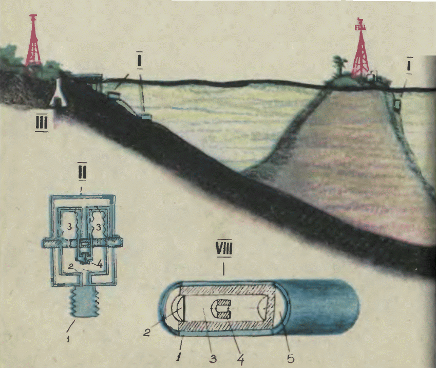 Внимание-опасность! В Дальневосточном гидрометеорологическом институте работает отдел цунами. Его задача - создать новую автоматизированную службу оповещения населения прибрежных зон о надвигающейся опасности. У берегов Камчатки, Курильской гряды и Сахалина, а также далеко в океане, непосредственно в зоне возможных землетрясений, ученые устанавливают множество приборов и датчиков. В первую очередь чуткие приборы - сейсмографы - ведут наблюдения за сейсмической деятельностью Земли. Они улавливают упругие волны, по которым определяются координаты эпицентра в энергия подводного землетрясении. Если энергия велика, а эпицентр находится в районе, откуда чаще всего появляются высокие волны, то сигнал предупреждения по линиям проводной и радиосвязи передается на гидрометеорологические станции, ведущие наблюдение за уровнем моря. Получив сигнал, наблюдатели следят за показаниями самопишущих уровнемеров, пытаются зарегистрировать первые, обычно небольшие волны цунами. Но обнаружить их не так-то просто. Ветровые волны накатываются на берег через каждые полминуты. Дважды в сутки уровень океана поднимается во время приливов. А вот волны цунами налетают на берег с интервалом 10-150 мин. Как же тогда отличить волну ветровую, приливную от цунами? В вертикально установленной трубе, сообщающейся с морем, плавает поплавок. Он поднимается или опускается и приводит в движение перо, записывающее на ленте колебания уровня. Столб жидкости на глубине, скажем, 10 м создает давление, равное одной атмосфере. Но море редко бывает спокойным. Поэтому, если на определенной глубине установить манометр, по его показаниям можно судить о высоте волны. Ветровые и приливные волны, накладываясь одна на другую, как бы затушевывают первые, еще невысокие волны цунами. Выделить их с помощью поплавковых и гидростатических приборов очень трудно. В дополнение к ним установлен еще один прибор. Он получил название детектора волн цунами. Познакомимся с его устройством (см. рис.). Металлическая гофрированная чашка 1 под действием гидростатического давления сжимается. Два капилляра разного диаметра 2 связывают полость чашки с двумя одинаковыми камерами 3, внутри которых установлены тоже гофрированные чашки, но меньшего размера. Их внутренние полости сообщаются с измерительной камерой 4, разделенной мембраной на две части. Внутренние полости трех чашек заполнены несжимаемой жидкостью. На мембране установлен датчик. Как реагирует детектор на колебания уровня моря? Приливные волны только дважды в сутки накатываются на берег. Медленно меняется уровень моря, следовательно, постепенно нарастает гидростатическое давление в том месте, где установлен прибор. Металлическая чашка постепенно сжимается, вытесняя часть жидкости практически без сопротивления по капиллярам во внутреннюю полость измерительной камеры. Давление с обеих сторон мембраны одинаковое, прибор молчит. Молчит прибор и тогда, когда на море обычные ветровые волны. Встречая в капиллярах значительное сопротивление, жидкость не успевает перетекать с достаточной скоростью. На мембрану и в этом случае действует постоянное давление. Только при подходе волн цунами начинает сказываться эффект различного сопротивления капилляров. Капилляр большего диаметра создает меньшее сопротивление потоку жидкости, 