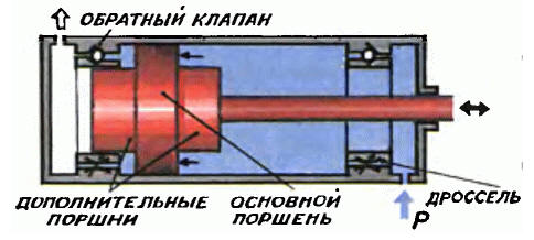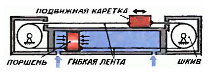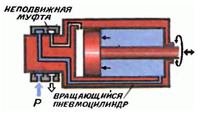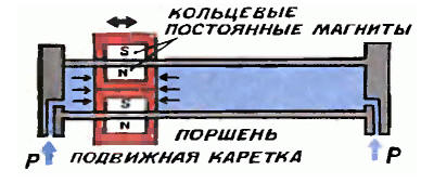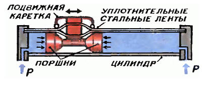 Расскажем несколько подробнее об этих механизмах. Простейший пневмодвигатель - мембранный исполнительный механизм с возвратной пружиной, которая сжимается при прямом ходе. Основные его преимущества - простота конструкции, герметичность рабочей полости и всего одна командная пневматическая линия. А главный недостаток - сравнительно малый рабочий ход. Мембранный механизм нашел широкое применение в нефтехимической и газовой промышленности, а также на транспорте. Он открывает двери автобусов, приводит в действие тормоза железнодорожных вагонов и грузовых автомобилей. Еще более популярен среди машиностроителей поршневой пневмоцилиндр. Цилиндры одностороннего действия похожи на мембранные двигатели и имеют те же преимущества и недостатки. Пневмоцилиндры двухстороннего действия обеспечивают значительно большие рабочие хода, а потому чаще используются. До недавнего времени выходным звеном в таких двигателях служил только шток. Когда в одну из полостей цилиндра подается сжатый воздух, другая полость соединяется с атмосферой. Поэтому в пневмоцилиндре двухстороннего действия поршень со штоком могут находиться только в двух крайних устойчивых положениях - либо шток полностью втянут, либо полностью выдвинут. Когда диаметр цилиндра ограничен, используют сдвоенный или даже строенный пневмоцилиндр. Он представляет собой два или три последовательно соединенных между собой цилиндра, работающих на один общий шток. При этом усилия, действующие на поршни, складываются. Если пневмоцилиндр установлен вертикально, то при прекращении подачи сжатого воздуха его шток под действием силы тяжести может опускаться. Для предотвращения этого явления фирма ФЕСТО (Австрия) разработала пневмоцилиндр, в котором шток надежно фиксируется специальным механизмом, а при подаче сжатого воздуха снова освобождается. Передача движения с помощью штока имеет целый ряд недостатков. Во-первых, шток нужно уплотнять. Во-вторых, при полном выдвижении штока общая длина пневмоцилиндра увеличивается почти вдвое. В-третьих, величина рабочего хода ограничена жесткостью штока - при большой длине хода шток начнет изгибаться. За последние годы рядом зарубежных фирм разработаны бесштоковые пневмоцилиндры, лишенные этих недостатков. Так, фирма ФЕСТО разработала конструкцию, в поршень и каретку которой встроены сильные постоянные кольцевые магниты. При движении поршня за счет действия магнитных сил наружная подвижная каретка также перемещается вдоль оси цилиндра. С ней скрепляется рабочий орган машины. Это дает следующие преимущества. Во-первых, общая длине цилиндра при движении поршня не изменяется, а во-вторых, такой цилиндр может обеспечить значительно больший рабочий ход по сравнению с обычным - до 10 и более метров. Кроме того, уплотнение необходимо только между поршнем и цилиндром, а сам цилиндр с двумя подводами сжатого воздуха становится герметичной конструкцией. В бесштоковом пневмоцилиндре фирмы ОРИГА (Швеция) поршень жестко связан с размещенной на наружной поверхности цилиндра подвижной кареткой через раздвижную продольную щель. Уплотняется эта щель с помощью двух гибких стальных лент (внутренней и наружной) и постоянных магнитов. Жесткая связь поршня с кареткой обеспечивает зависимость передаваемого рабочего усилия от давления сжатого во