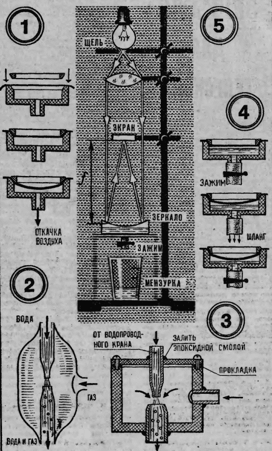 Зеркало для телескопа. Детская научная лаборатория Справочник / Детская научная лаборатория Во многих пособиях для астронома-любителя рассказывается о том, как самому изготовить простейший телескоп-рефлектор. В этом телескопе роль объектива играет вогнутое зеркало. И самая большая сложность состоит в том, чтобы изготовить это зеркало в домашних условиях. Процесс этот сложный, требующий изготовления приспособлений для шлифовки и полировки, серебрения толстых стеклянных заготовок. А нельзя ли поступить как-нибудь иначе? Давайте попробуем изготовить зеркало из... металлизированной лавсановой пленки. Чтобы лучше понять, как это можно сделать, давайте пофантазируем. Представим себе, что у нас в руках консервная банка без одного донышка, на которое туго натянута наша пленка. Пока это плоская зеркальная поверхность. Что произойдет, если давление в банке станет меньше атмосферного? Пленка прогнется. Вот и получилась вогнутая посеребренная поверхность. Идея проста - значит, можно попробовать изготовить таким образом зеркале для телескопа. Но сначала давайте разработаем конструкцию "банки". И еще подумаем над тем, как и чем будем создавать внутри требуемое разрежение для получения поверхности нужной кривизны. Оговоримся сразу: мы сознательно не будем ограничивать вас выбором размеров, материалов и другими подробностями, укажем лишь основное направление для поиска. Вариант конструкций "банки" приведен на рисунке 1. Это цилиндрический стакан, выточенный на токарном станке из оргстекла. Станок имеет вывод, который в дальнейшем потребуется для откачки воздуха. Кольцо - еще одна деталь конструкции. Оно изготовлено из того же материала, что и стакан. Кольцо опускается сверху на натянутую на края стакана пленку и герметично ее зажимает. Теперь подумаем над способом откачки воздуха из стакана. Самое простое решение - раздобыть поршневой насос. А может, все-таки попытаться его сделать своими руками? Каким образом? Вспомним, какой интересный случай произошел с Даниилом Бернулли, известным физиком. В помещении под потолком находился открытый люк. Однажды в этот люк подул сильный ветер. Люк захотели закрыть щитом. И когда человек стал подниматься по лестнице с поднятым над головой щитом, ветер увлек щит вверх и прижал к люку. Теперь-то, зная эффект Бернулли, мы без труда можем объяснить случившееся. Попытаемся использовать втягивающее действие воздушной струи в самодельном водоструйном насосе. Идея здесь очень проста. Водоструйный насос состоит из баллона с тремя отводами (см. схему на рис. 2). По одному из отводов подается вода, по другому она вытекает, а третий отвод соединяется с емкостью, из которой нужно удалить газ. Такую картину мы наблюдаем, рассматривая насос снаружи. А что же происходит внутри баллона? Как известно, при движении жидкости по трубе переменного сечения скорость ее больше там, где труба уже, а чем больше скорость, тем меньше давление внутри жидкости. Об этом нам говорит закон Бернулли. Струя воды, вытекающая из суженной части трубки внутри баллона, имеет большую скорость, внутри струи создается область низкого давления. Воздух втягивается потоком и уносится вместе с водой из баллона. Просто? Тогда приступим к изготовлению насоса. Рис. 1. Консервная банка без одного донышка, на которое туго натянута пленка. Если давление 