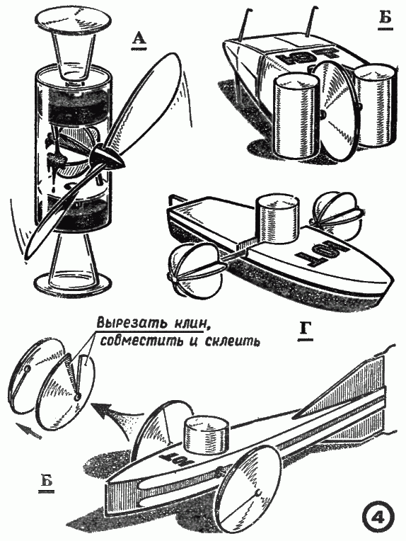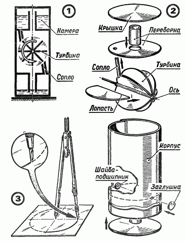 Двигатель-непроливайка. Личный транспорт Справочник / Личный транспорт: наземный, водный, воздушный Однажды, зайдя к своим соседям, я увидел на письменном столе их сына семиклассника Володи Прохорова необычный приборчик - цветной цилиндр с пропеллером. Пригляделся повнимательнее, вижу - самоделка, а как работает, не пойму. Попросил Володю рассказать. Он, хитро улыбнувшись, перевернул цилиндр и снова поставил его на стол. Пропеллер тут же весело завертелся, гоня по комнате легкий ветерок. Потом юный изобретатель открыл секрет. Копаясь как-то в старых журналах, он случайно обнаружил заметку, рассказывающую об интересной идее - песочном двигателе. Автор изобретения Ф. Антоненко предлагал двигатель, принцип действия которого напоминал медицинские песочные часы. Устроен он был так. Две камеры соединялись трубой, в середине которой располагалась турбина, похожая на колесо водяной мельницы. Достаточно было завести двигатель, то есть перевернуть его, и песок через специальное отверстие начинал ссыпаться вниз, попадал на лопатки турбины и вращал их. Идея двигателя понравилась Володе, и он решил проверить ее на модели. Достал мелкий песок, спаял цилиндр, трубу с турбиной.. Но дальше этого дело не пошло, и причиной тому был движитель, то есть песок. Он попадал в подшипниковые узлы модели и заклинивал их. От уплотнителей, которые бы не давали песку затекать в подшипники, юный экспериментатор отказался. И вот почему. Во-первых, из-за сравнительно небольших размеров модели сделать их очень трудно. Во-вторых, любые уплотнения, как известно, создают сопротивление вращению вала. И мощности маленького устройства могло не хватить для его преодоления. Тогда Володя Прохоров решил заменить песок обычной водой, а внутренние переборки корпуса двигателя сделать по принципу чернильницы-непроливайки. Как только конструкция двигателя прояснилась, сразу же встал вопрос - какой материал использовать для его постройки? Решил попробовать тонкий листовой целлулоид. Сначала рассчитал примерный размер корпуса двигателя. Из целлулоида вырезал заготовку 400x750 мм {припуск на склейку 3 мм). Склеил из нее цилиндр-корпус (рис. 1 и 2). Делал это аккуратно и точно, иначе при склейке могли бы образоваться щели, и тогда вода стала бы выливаться из цилиндра. Заготовки склеивал нитроклеем, приготовленным из ацетона и растворенных в нем кусочков целлулоида. Кстати, можно использовать и покупные клеи, например, "Суперцемент" или "Мекол". Для вырезания донышек использовал циркульный резак (рис. 3). Сделан он из обычного школьного циркуля - вместо грифеля в цангу вставлен остро заточенный отрезок закаленной стальной проволоки. Самая, пожалуй, ответственная и трудоемкая операция - сборка емкостей для воды. Склеиваются они из той же целлулоидной пленки, что и корпус. Сначала по диаметру корпуса вырезаются кружочки, в них проделывают отверстия диаметром 35-40 мм. По размеру отверстий изготавливаются цилиндрики высотой 85-90 мм - их герметично вклеивают в кружочки. Но это еще не все. Чтобы вода вытекала из рабочих камер, в основание емкостей нужно вклеить трубочки-сопла диаметром 3 мм и длиной 25-30 мм. Сопло можно изготовить так. Разогрейте в кипящей воде целлулоидную заготовку, а когда она станет пластичной, накрутите ее на стальную спицу диаметром чуть меньше 3 мм. Потом склейте заготовку, 
