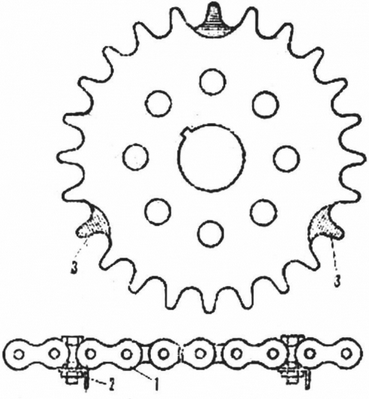 Ãóñåíèöà èç öåïè è çâåçäî÷êà ê íåé: 1 - ìîòîöåïü, 2 - ãðóíòîçàöåï, 3 - ñðåçàåìûå çóáüÿ.