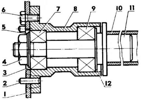 Подшипниковый узел колеса: 1 -диск колеса: 2- штифт центрирующий; 3, 12 - пыльники; 4 - гайка М24 (М24 лев.); 5 шайба; 6 болт М12; 7 подшипник 7605; 8 - ступица (сталь 45). 9 - подшипник 7606; 10 - ось моста; 11 - цапфа (сталь 45)