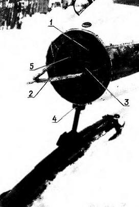 Носовая часть аэросаней без обтекателя: 1 - механизм рулевой, 2 - кронштейн крепления носового обтекателя, 3 - муфта упругая. 4 - корпус подшипника 46206, 5 - балка поперечная