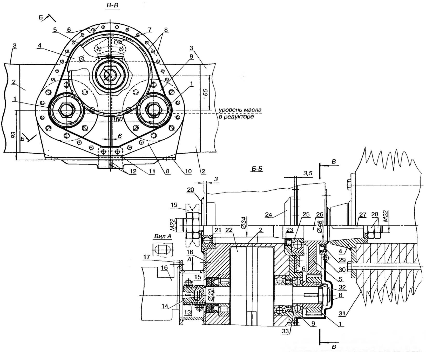Двигатель и редуктор (воздушный винт условно не показан, поз.8 разрезана по В-В) (нажмите для увеличения): 1 - шестерни ведущие, 2 - картеры, 3 - корпуса цилиндров, 4 - втулка воздушного винта, 5 - шестерня ведомая, 6 - пластина задняя, 7, 11 - дополнительные кронштейны крепления задней пластины, 8 - крышка редуктора, 9 - корпус подшипника (АЛ 5), 10 - фланец крепления двигателя к подмоторной раме, 12 - прокладка, 13-муфта соединительная, 14 - насадка вала привода магнето (сталь 45), 15 хомут (2 шт.), 16 - магнето, 17 кронштейн крепления магнето (Ст3). 18 - пластина передняя, 19- шкив привода генератора, 20, 24- корпуса подшипников (Ст3), 21 - подшипник 180206, 22 - вал коленчатый, 23. 29 -манжеты, 25 - подшипник 46208, 26 - вал воздушного винта (40ХГСА), 27 - шпонка, 28 - гайки М22, 30 - корпус манжеты (Ст3), 31 - воздушный винт, 32 - переходник (сталь 45), 33 - подшипник 305