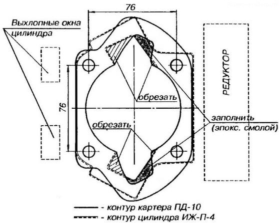 Двигатель М-40 - один из вариантов уже знакомой читателю модульной (модуль -это цилиндр и картер с коленчатым валом) конструкции из готовых узлов и деталей, но более простой в изготовлении оппозит со встроенным редуктором. У него, как и у предыдущих моделей, цилиндры, головки и карбюраторы заимствованы от "Иж-Планеты", картеры, коленвалы и поршни в сборе - от ПД-10, а шестерни редуктора (z=20 и z=53) - от мотора Д-240 трактора МТЗ-80.