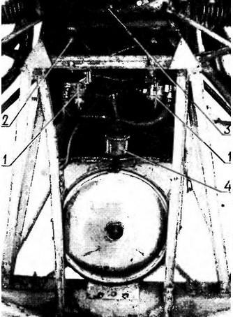 Вид сзади на подмоторную раму и агрегаты двигателя: 1 - бензонасосы, 2 - один из узлов крепления двигателя к подмоторной раме, 3 - пробка сливная, 4 - бензофильтр.