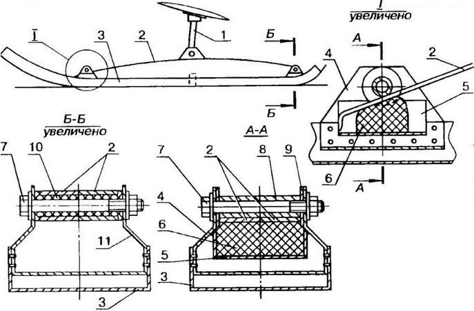 Крепление рессор к передней лыже: 1 - стойка, 2 - рессора, 3-лыжа. 4 - кронштейн передний (Ст3, лист s2) 5 - полка (Ст3, лист s2), 6 - подушка (резина), 7 - пальцы (болт М10), втулка распорная (Ст3, труба 14x1,5), 9 - шайба (Ст3, лист s2), 10 - втулка резиновая, 11 - кронштейн задний (Ст3, лист s2).