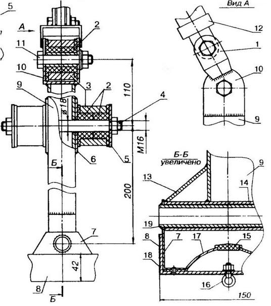 Задняя опора (левая): 1 - кронштейн амортизатора (Ст3, лист s3), 2 - втулки резиновые (от "Мос-квнча-412"), 3 - рессоры, 4 - палец нижних рессор (сталь 45, спецболт М16), 5 - щека (Ст3, лист s2), 6 накладка (Ст3, лист s3), 7 - кронштейн (Ст3, лист s3), 8 - обшивка лыжи, 9 стойка (Ст3, труба 40x25x2.5), 10 - кронштейн верхней рессоры (Ст3, лист s3), 11 - палец верхней рессоры (болт М16). 12 амортизатор, 13 подкос (СтЗ, лист s1,5). 14- корпус шарнира (Ст3, груба 30x3). 15 пробка (резина), 16 - подрез, 17 - усилитель. 18 - подошва. 19 - ось шарнира (Ст3, груба 24x2.5)