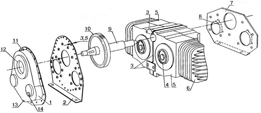 Основные детали и узлы двигателя: 1 - крышка редуктора, 2,1 - пласт ины задняя и передняя (Ст3, лист sЗ,5), 3 - прокладки с дополнительными кронштейнами крепления задней пластины (Ст3, лист s6), 4 - ведущая шестерня (z=20, 2 шт.), 5 - картеры, 6 - корпус цилиндра, 8 - кронштейн крепления магнето, 9 - вал воздушного винта, 10 - шестерня ведомая (z=53), 11 -пробка заливной горловины, 12 - корпус манжеты, 13 - пробка сливная, 14 - заглушка отверстия контроля уровня масла