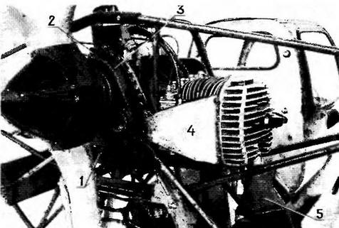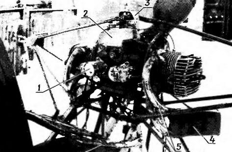 Вид передней части двигателя: 1 - магнето, 2 - бачок пусковой, 3 - механизм управления карбюраторами, 4 - глушитель, 5 - трубы выхлопные, 6 - спинка сиденья пассажира откидная