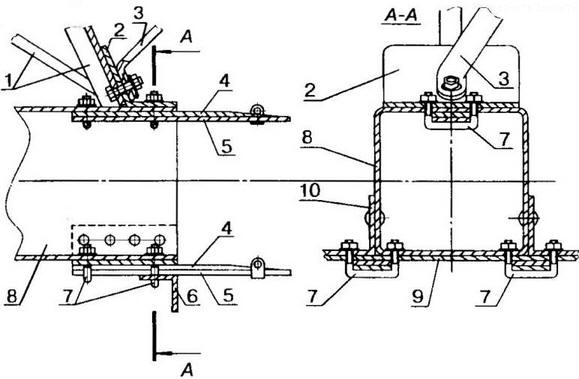 Крепление задних рессор: 1 -элементы подмоторной рамы, 2 -кронштейн (Ст3, лист s2), 3 - элемент ограждения воздушного винта, 4-подрессорники, 5 - рессоры, 6 - балка продольная (Д16Т, уголок 30x30), 7 - стремена (сталь 45, пруток Ø6), 8 - балка поперечная, 9 - пластина усиления (Д16Т, лист s5), 10 - полка (Д16Т, уголок 30x30).